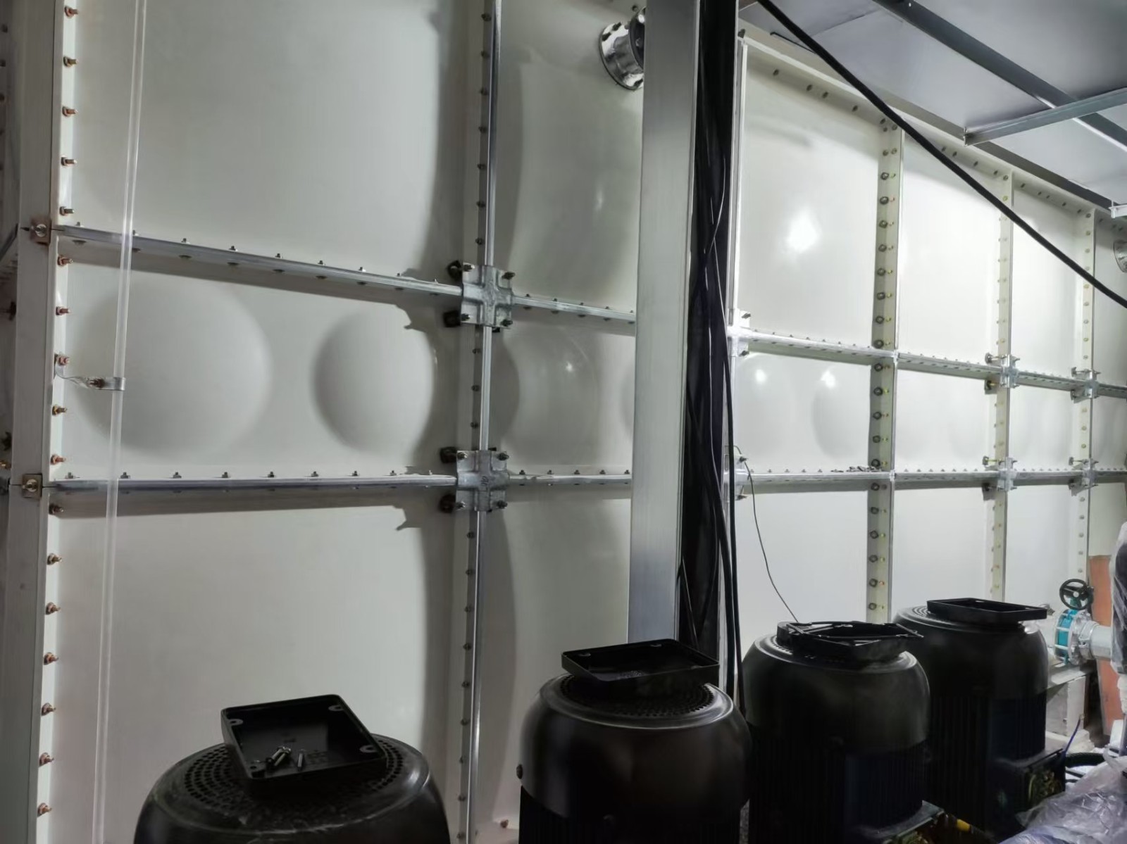裝配式玻璃鋼水箱是一種普遍采用的儲水方式,由SMC單元板現場組裝而成的一種水箱。單元板用SMC(sheet moulding compound)片材在高溫高壓下模壓成型,內部采用加強式支撐,其配件選用熱鍍鋅件和不銹鋼件均可。板塊厚度的選取依據板塊所受的壓力和所處的位置。有5mm、8mm、10mm、12mm、14mm、16mm等。模壓成型的方式,增加了抗震、抗沖擊的強度,克服了手糊制品強度不均勻的缺點,提高了耐壓強度和使用壽命。無滲漏,無變形,保養、檢修方便;在有限的空間內存放和安裝,很容易擴大或更換,施工方便。